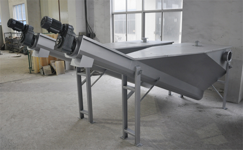 砂水分離器設(shè)備一般螺旋傾角為25~30°之間,砂水混合液從進(jìn)水管進(jìn)入本設(shè)備,混合液通過分離機(jī)上部的聚集箱,在水流的作用下,使混合液的砂粒與有機(jī)物進(jìn)行分離,砂水進(jìn)入集砂槽中,比重較大的顆粒(如砂粒)由于自重而下降,沉積于螺旋槽底部,在螺旋葉片的推動(dòng)下,物料沿斜置的U型槽底部提升,離開液面后,繼續(xù)上移一段距離,砂粒中的水分逐漸在螺旋槽葉片的空隙中流回水箱,砂粒液逐漸干化到出料口處,依靠自重落入其他輸送裝置中,上清液則不斷從排水堰溢流出去,有機(jī)物在水流漩渦的作用下,也跟著上清液從溢流槽流出,回流至污水井中,從而達(dá)到砂水分離的作用。