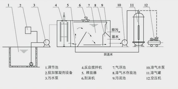 加壓溶氣氣浮在國內外應用廣泛,該法師將原水加壓至0.3~0.4MPA,同時通入空氣,使空氣溶解與水中并達到相應壓力狀態下的飽和值,然后驟然減至常壓,溶解于水中的空氣以微小氣泡的形式從水中釋放出來,氣泡直徑約為Ø20~Ø100μm左右,目前的基本流程有全部進水加壓溶氣氣浮、部分進水加壓溶氣氣浮、部分處理水回流加壓溶氣氣浮等三種,都是由加壓泵、溶氣罐、釋放器和氣浮池等基本設備組成。
