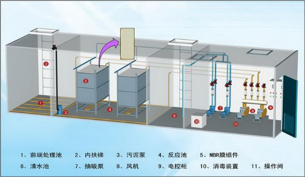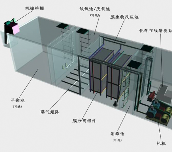 MBR一體化設備利用膜生物反應器(MBR)進行污水處理及回用的一體化設備,其具有膜生物反應器的所有優點:出水水質好,運行成本低、系統抗沖擊性強、污泥量少,自動化程度高等,另外,作為一體化設備,其具有占地面積小,便于集成。它既可以作為小型的污水回用設備,又可以作為較大型污水處理廠(站)的核心處理單元,是目前污水處理領域研究的熱點之一,具有廣闊的應用前景。